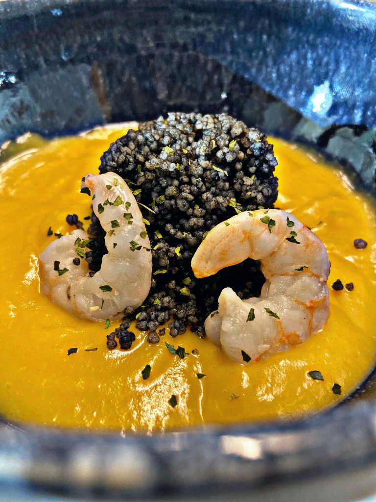 CREMA DE CALABAZA CON CUSCÚS NEGRO Y GAMBAS