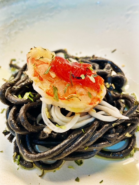 SPAGHETTI NERO DI SEPPIA CON GULAS, GAMBAS Y PIMIENTOS CARAMELIZADOS